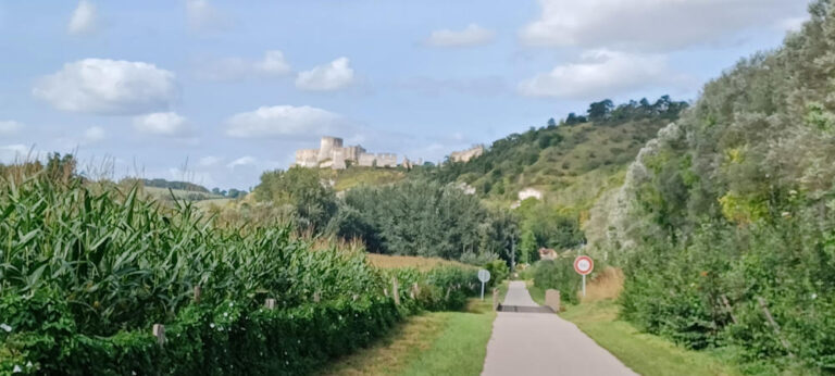 Arrivée aux Andelys sur une magnifique Voie verte très roulante après un beau parcours de 101kms et vue sur Château Gaillard pour récompense!