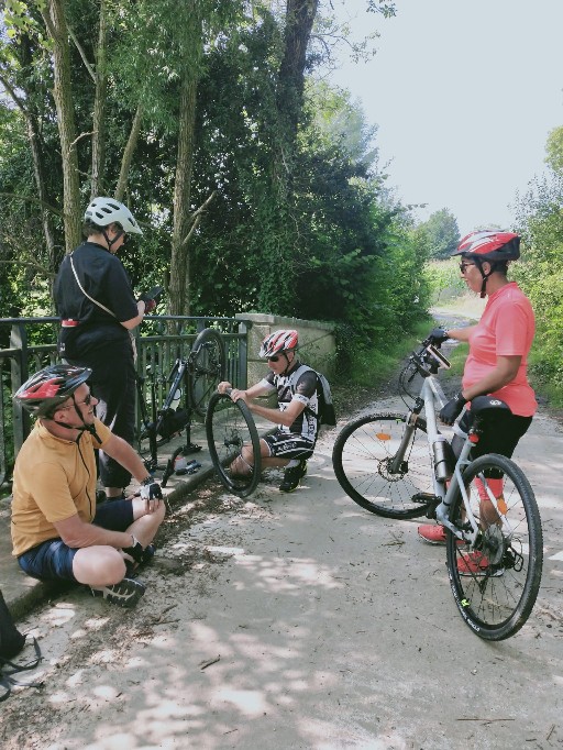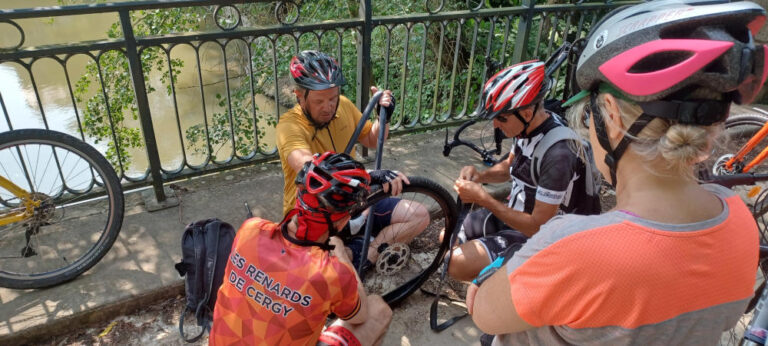 Sans oublier les inévitables crevaisons après avoir crapahuté à travers champs et chemins empierrés!! et pendant que les techniciens réparent...